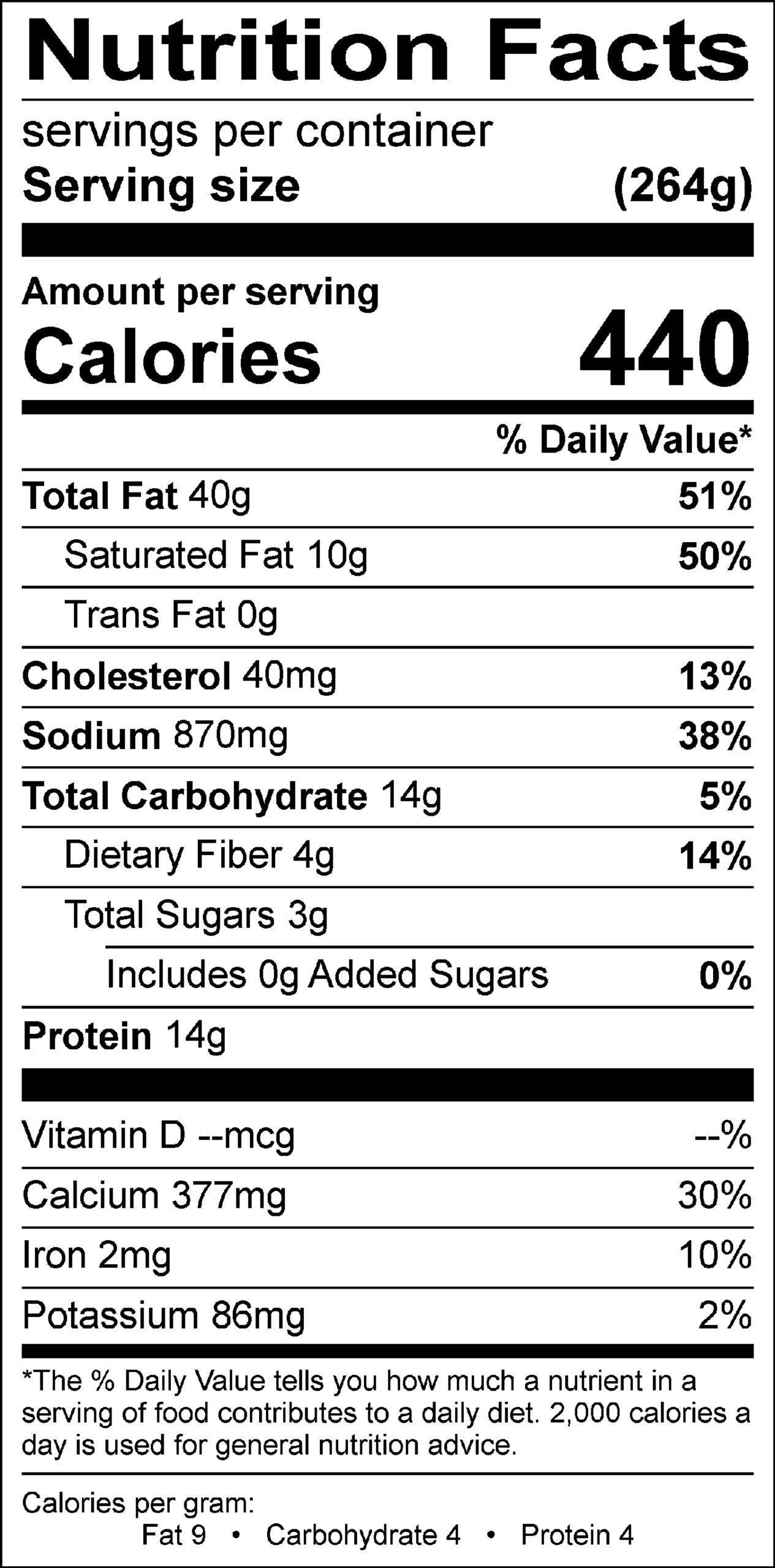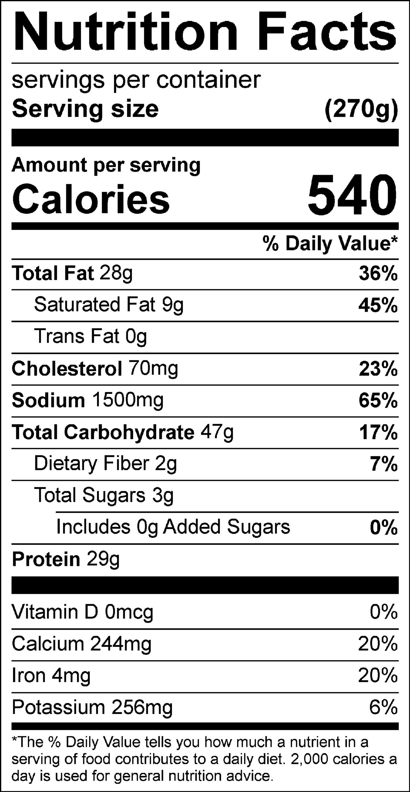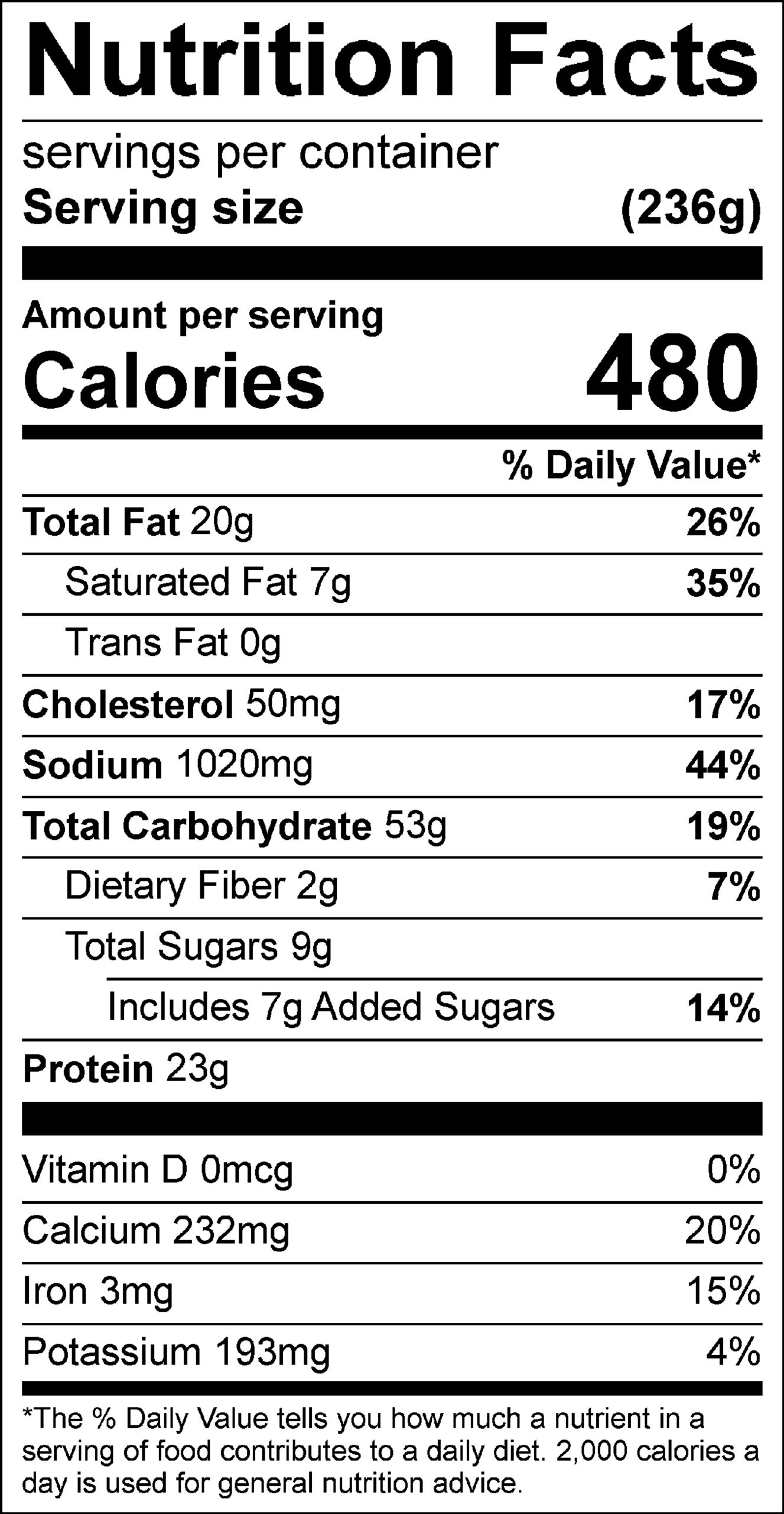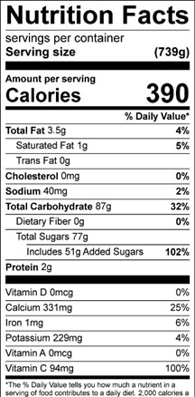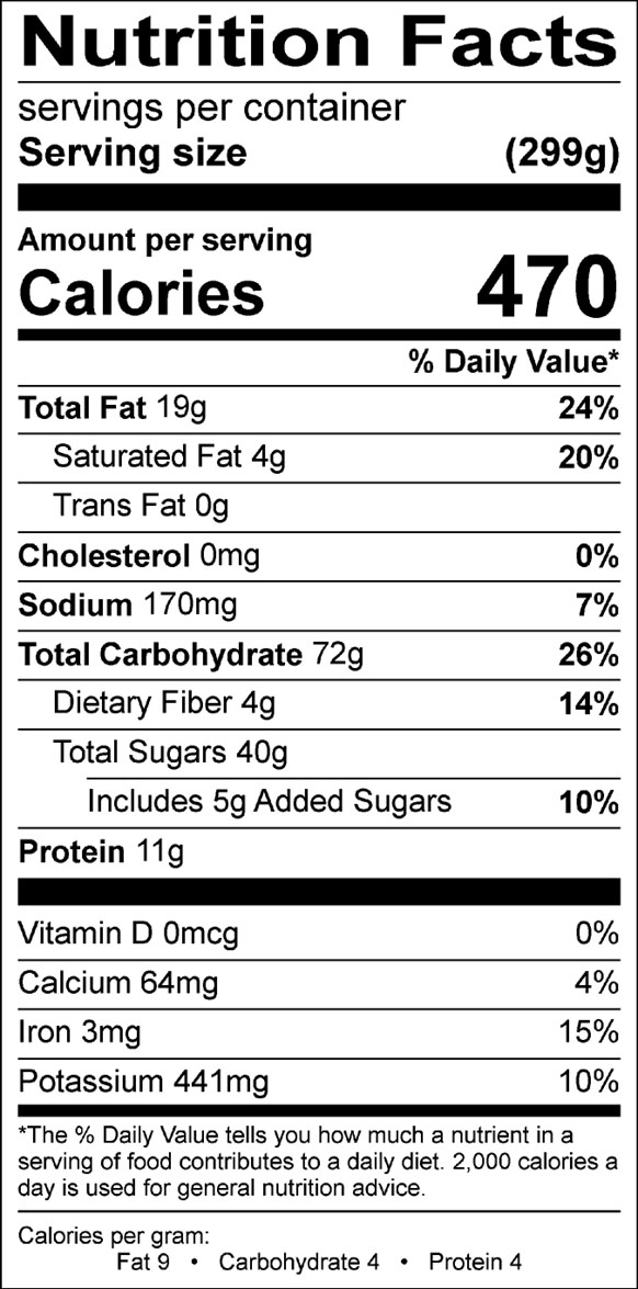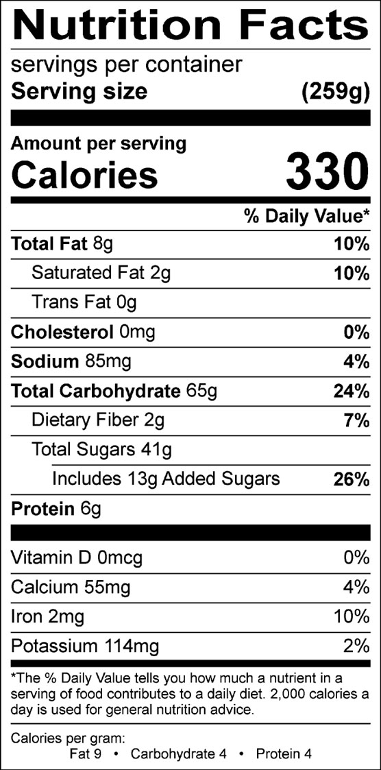 Serving Size: 9oz., Calories: 400, Calories from Fat: 70, Total Fat: 8(g), Saturated Fat: 0(g), Cholesterol: 5(mg), Sodium: 95(mg), Total Carbs: 76(g), Dietary Fiber: 6(g), Sugars: 45(g), Protein: 12(g), Vitamin A: 0%, Vitamin C: 20%, Calcium: 20%, Iron: 10%