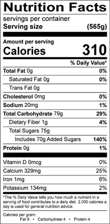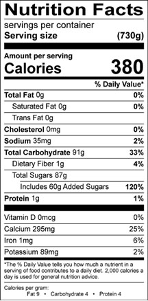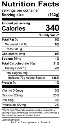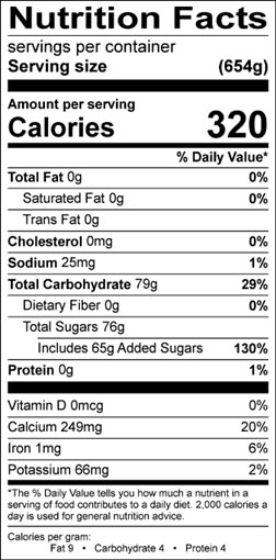 Serving Size: 6oz., Calories: 160, Calories from Fat: 0, Total Fat: 0(g), Saturated Fat: 0(g), Cholesterol: 5(mg), Sodium: 95(mg), Total Carbs: 35(g), Dietary Fiber: 0(g), Sugars: 28(g), Protein: 5(g), Vitamin A: 0%, Vitamin C: 0%, Calcium: 20%, Iron: 2%