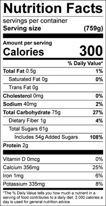 Serving Size: 9oz., Calories: 240, Calories from Fat: 5, Total Fat: 0(g), Saturated Fat: 0(g), Cholesterol: 5(mg), Sodium: 140(mg), Total Carbs: 54(g), Dietary Fiber: 0(g), Sugars: 49(g), Protein: 9(g), Vitamin A: 0%, Vitamin C: 0%, Calcium: 30%, Iron: 0%