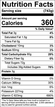 Serving Size: 12oz., Calories: 370, Calories from Fat: 40, Total Fat: 4.5(g), Saturated Fat: 1(g), Cholesterol: 5(mg), Sodium: 360(mg), Total Carbs: 78(g), Dietary Fiber: 1(g), Sugars: 62(g), Protein: 11(g), Vitamin A: 110%, Vitamin C: 130%, Calcium: 30%, Iron: 4%